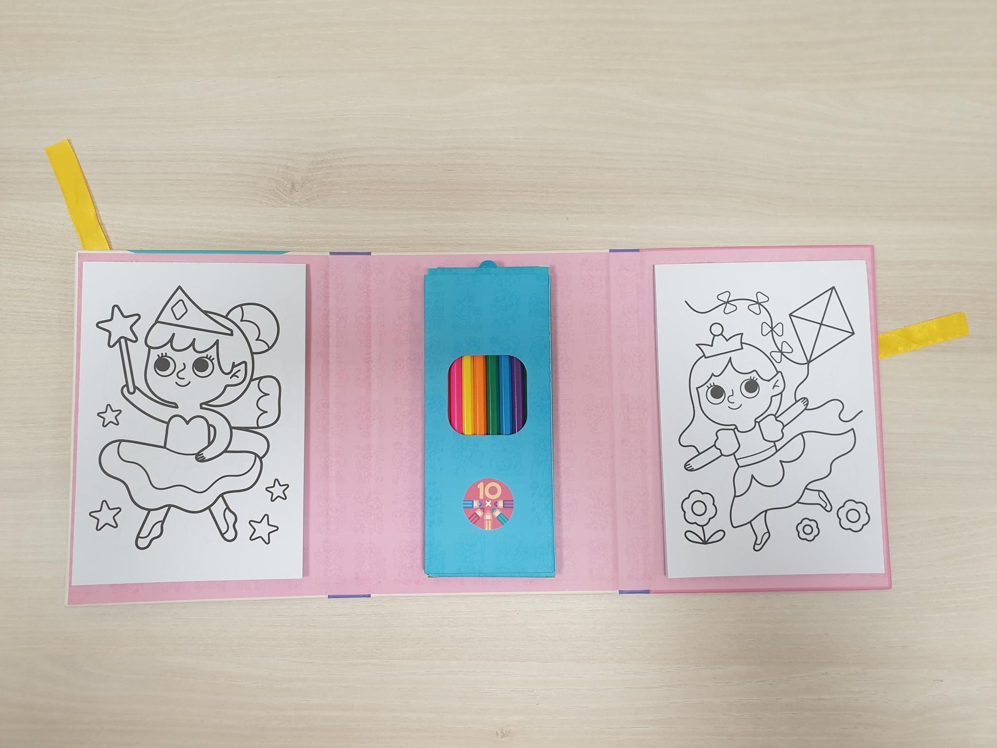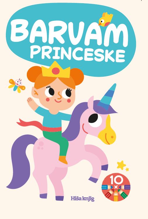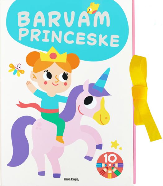 Pobarvanka z motivi princesk in pravljičnega sveta je zapakirana v darilno škatlo in zavezana z rumenim trakom. V notranjosti bodo otroci našli dva bloka po 24 pobarvank in na sredini škatlico z desetimi barvicami. Debele obrobe ilustracij otrokom pomagajo barvati bolj natančno ter razvijati fino motoriko.
