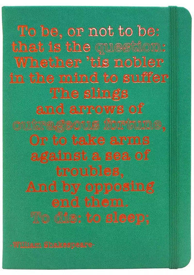 Pisalni blok z motivacijskim zapisom SHAKESPEARE na platnici: "To be, or not to be: that is the question: Whether 'tis nobler in the mind to suffer The slings and arrows of outrageous fortune, Or to take arms against a sea of troubles, And by opposing end them. To die: to sleep;' on the front cover".