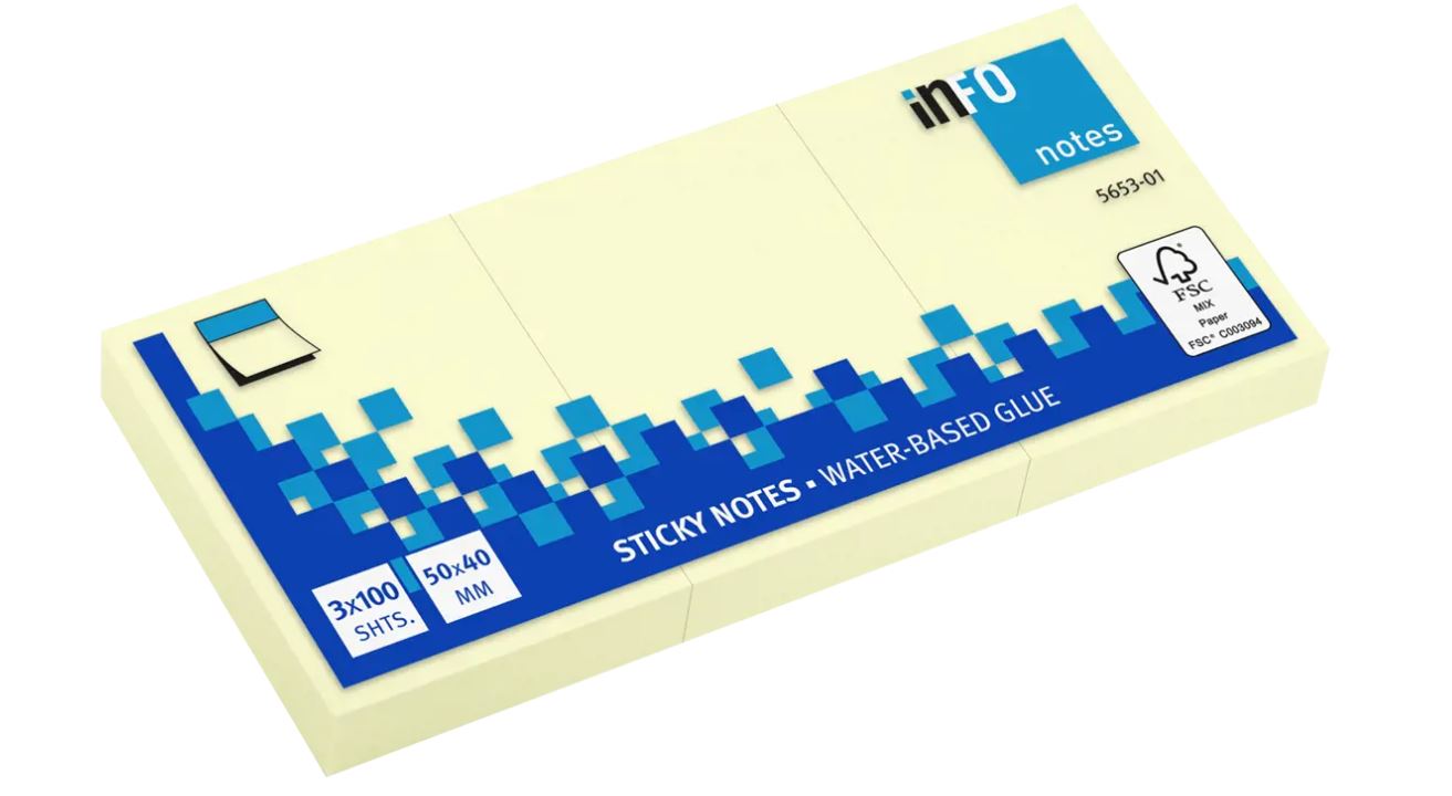 Samolepilni blok INFO 5653-01, 50 x 40 mm, 100 listov v bloku, 3 rumeni bloki v zavitku