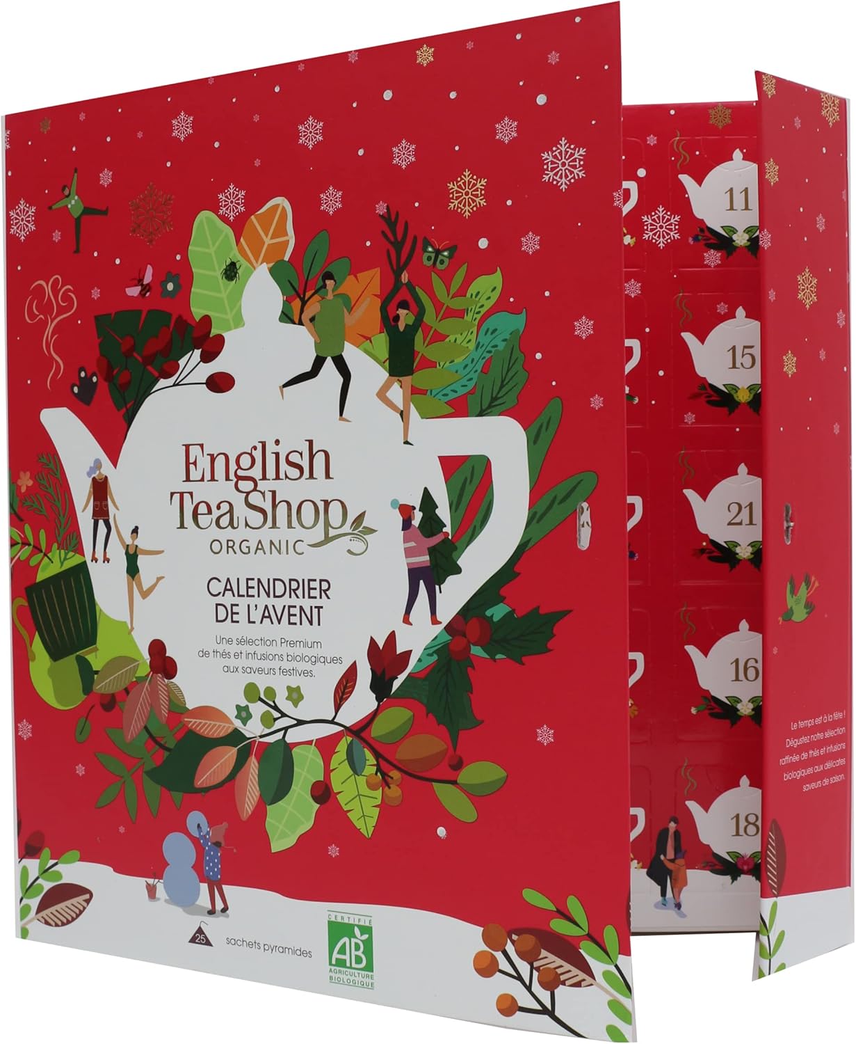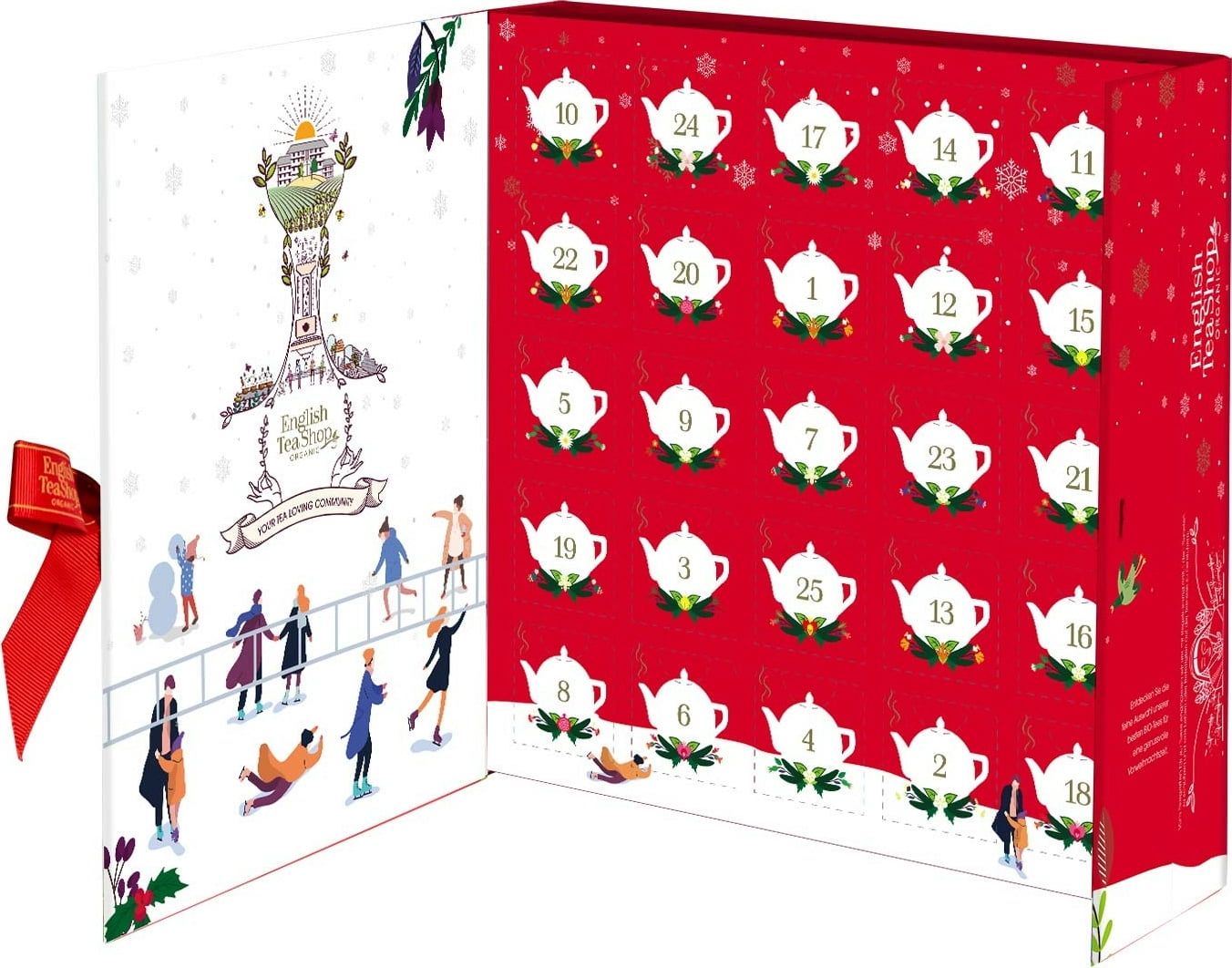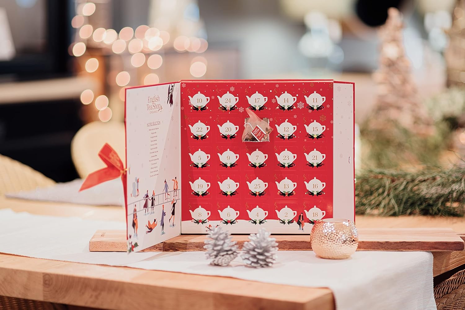 Uživajte v čajih English Tea Shop in se vsak dan do božiča pogrejte s skrbno pripravljenimi mešanicami čaja. V paketu je 2 x 12 visokokakovostnih čajnih okusov + 1 posebno presenečenje. Zapakirani so v praktične čajne piramidne vrečke, ki se med namakanjem razvijejo v popolne arome.