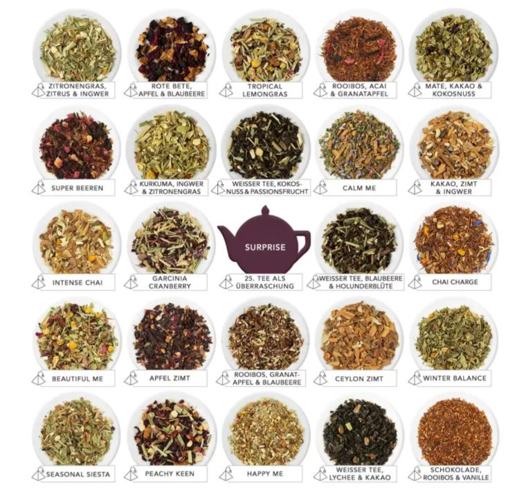 2x Praznična začimba – Sestavine: bio črni čaj (74 %), bio cimet (7 %), bio pomarančne lupine (4 %), bio ingver (3 %), bio poper (2,5 %), naravna aroma vanilije (2,5 %), bio nageljnove žbice (2%), bio muškatni orešček (2%), naravna aroma jabolka (2%), bio kardamom (1%).