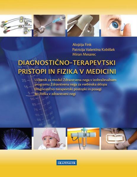 Učbenik za modul Zdravstvena nega za vsebinski sklop Diagnostični postopki in posegi in za modul Fizika v zdravstvu za program Zdravstvena nega. V vsebine diagnostično-terapevtskih postopkov in posegov so premišljeno in skrbno integrirane fizikalne vsebine, kar učiteljem in dijakom omogoča celosten pogled na snov. Obenem pa zaradi grafično jasno razmejenih obeh področij omogoča tudi ločeno obravnavo teh vsebin. Oblikovno in konceptualno je učbenik usklajen z učbenikom Zdravstvena nega pacienta pri življenjskih aktivnostih. Vsebina: Diagnostično terapevtski postopki in posegi Merske enote in fizikalne količine Antropometrične meritve Laboratorijske preiskave Funkcijske preiskave Endoskopske preiskave Punkcije in biopsije Radiologija Tomografija z jedrsko magnetno resonanco Ultrazvok Termografija Leče v zdravstvu Laser Aplikacija zdravil Rane NOVO