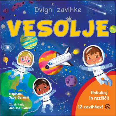 Kam gremo? V Vesolje! Z otrokom se odpravite na poučno potovanje v vesolje. V kartonki so zbrana zabavna presenečenja in zanimivosti o vesolju. Med stranicami se skriva kar 12 zavihkov, nekateri so dvojni! Odpravimo se v planetarij, raziščimo naše osončje, spoznajmo planete in zvezde, približajmo se Soncu in Luni in se sprehodimo po vesoljski postaji.