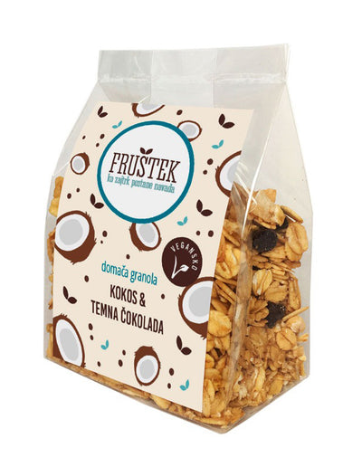 Domača granola Fruštek kokos in temna čokolada je odlična izbira za vse, ki prisegate na domačo granolo brez sladkorja in še posebej obožujete domačo granolo s čokolado, kokosom in cimetom. Domača granola Fruštek je lahko tudi izvirno in okusno darilo.