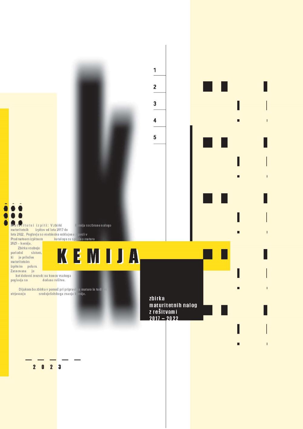 Zbirka je zasnovana kot delovni zvezek in vsebinsko usklajena s Predmetnim izpitnim katalogom za kemijo 2023. Na koncu vsakega poglavja so podane še rešitve.