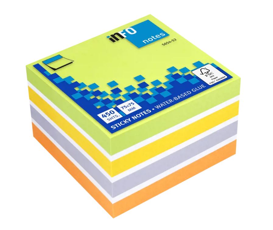 Kvalitetne, elegantne in okolju prijazne samolepljive kocke INFO so odlična rešitev za beleženje, organiziranje dela ali puščanje opomnikov in sporočil. Za uporabo v pisarni, doma, šoli oziroma povsod, kjer želimo pustiti kratko in vidno sporočilo.