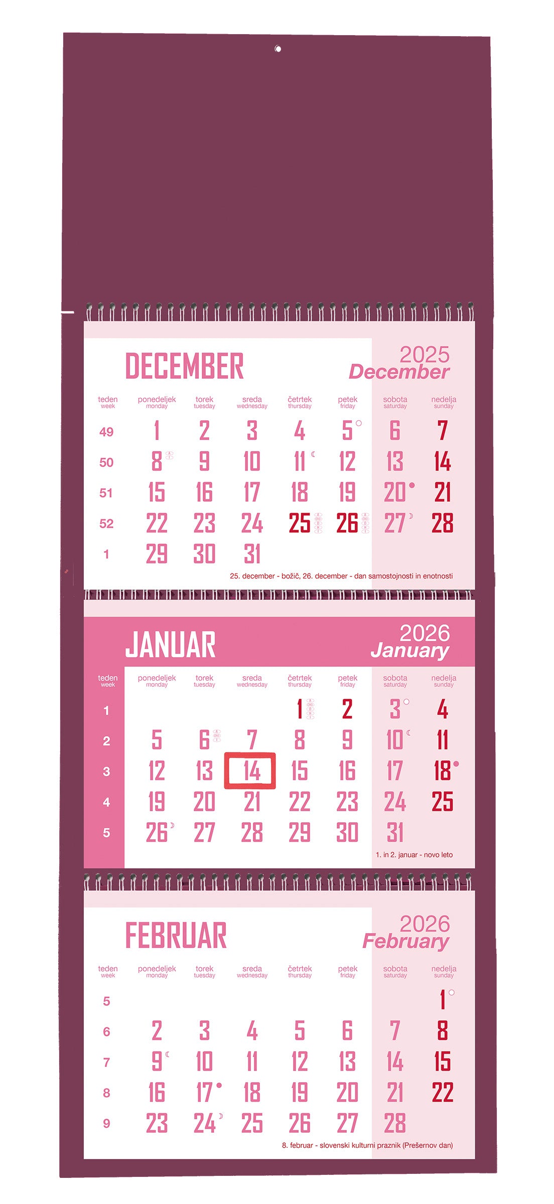 Koledar 2026 3-delni, spirala, bordo