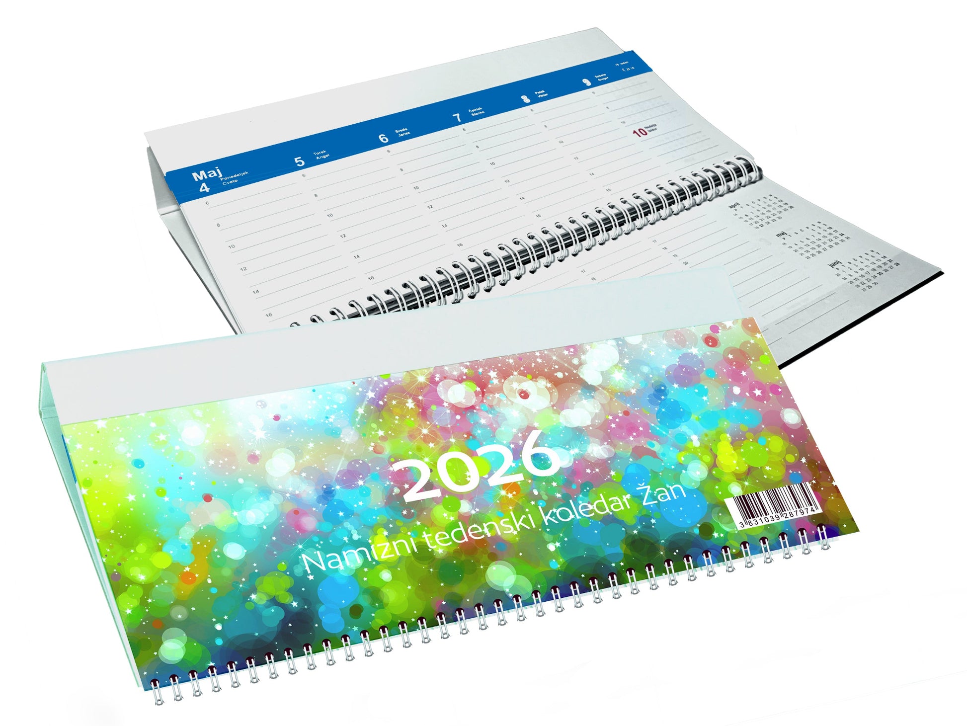 Namizni tedenski koledar Žan 2026, bel z modrim tiskom