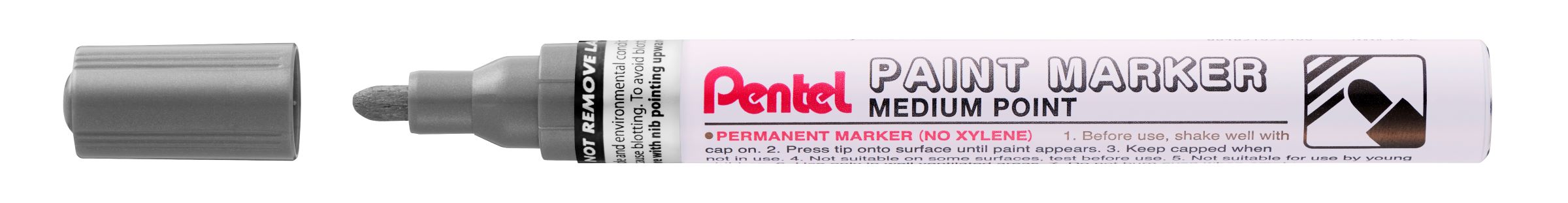 Hitro sušeči marker. Primeren za pisanje po gumi, kovini, steklu in plastiki. Debelina konice 4,5 mm. Brez ksilena.