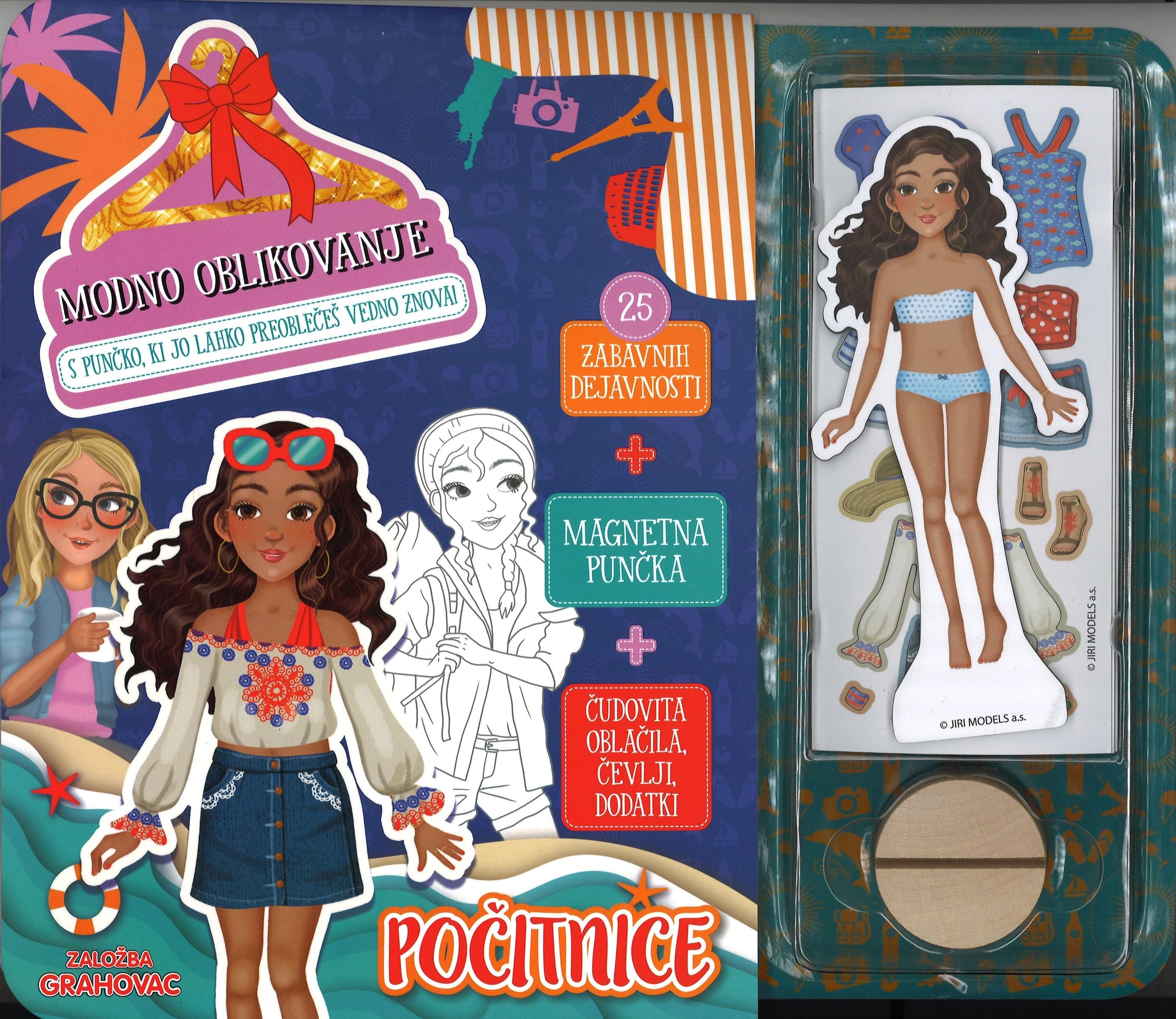 V tej čudoviti knjižici najdeš 25 strani zabavnih dejavnosti in pobarvank, magnetno punčko ter pole z magneti (oblačili, čevlji in dodatki).