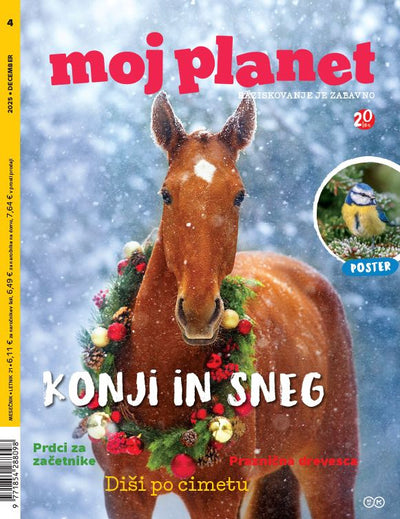 Z Mojim planetom vsak mesec bogatimo znanje ter skupaj opazujemo in raziskujemo naravo. Kaj prinaša december? Najprej pogledamo, kaj se dogaja pozimi v naravi. Predstavimo čudovite konjičke, jelene in košute, dr. Lučka Kajfež Bogataj razloži vse o virtualni vodi in vodi, ki jo vidimo, Mojca Furlan pa nas prepriča, da je bolje posvojiti oz. imeti doma po dve živali. Potopili smo se v praznično vzdušje in v dišeč in zdrav cimet ter premislili o tem, katero praznično drevesce je bolj primerno in kaj si za praznike resnično želijo psi. Tina Prodnik pa je pripravila tri slastne in zdrave recepte za sladke dobrote. Za piko na i nam Nina Wabra Jakič pojasni vse o plinih in vetrcih, ki jih spuščamo prav vsi po vrsti od kraljic naprej. Astronom nas vabi k opazovanju zimskih nebesnih biserov, pripravili smo čudovit živalski poster in odgovore priljubljenega dr. Vetka, da o stripu o Boru in Brini ne govorimo. Na nagradni kviz in naloge za sive celice pa tudi nismo pozabili. Imejte čarobne praznike in srečno novo leto!