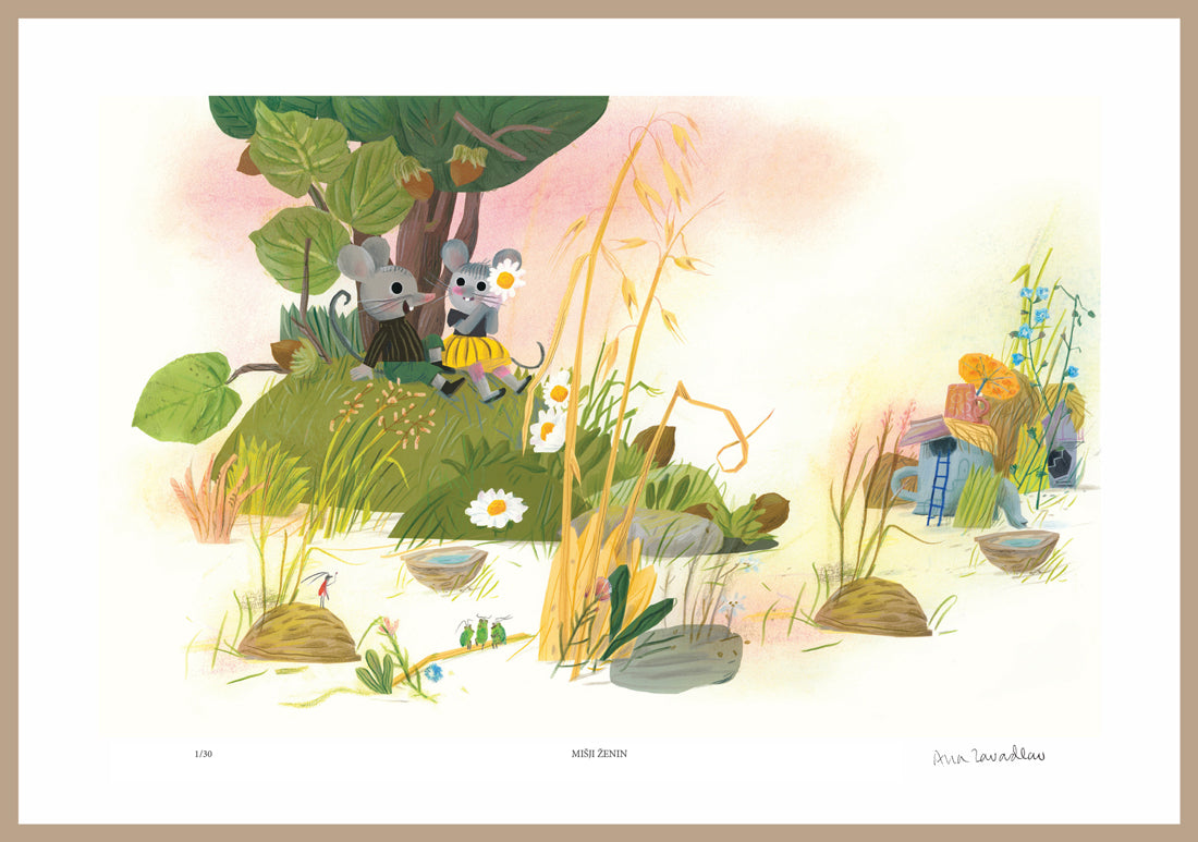 Oštevilčena barvna reprodukcija Mišji ženin s PODPISOM priljubljene ilustratorke Ane Zavadlav. Barvna reprodukcija razveselila otroke vseh starosti in bo lep okras otroške sobe. Reprodukciji je priložen certifikat o umetniškem delu. Vrhunski tisk na posebnem 270-gramskem bombažnem papirju, obstojne barve proti sončni svetlobi.