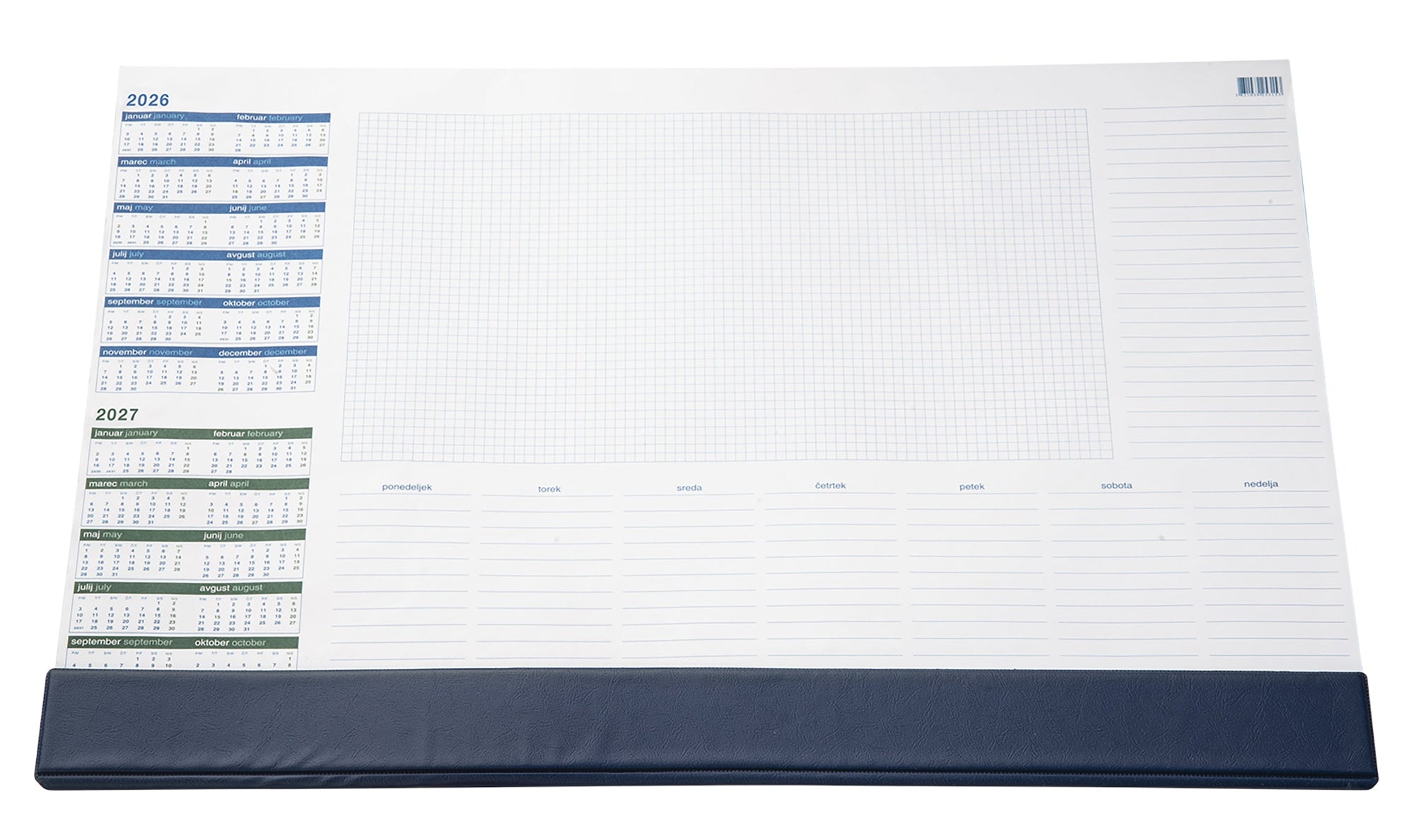 Namizna podloga s koledarjem za leto 2026. Modra PVC pasica.