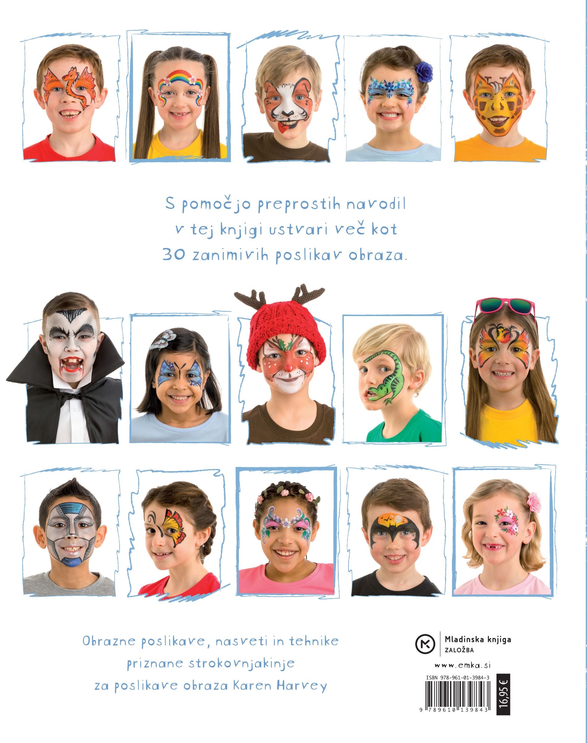 V knjigi najdete poslikave, ki so zelo priljubljene med otroki. Izbirate lahko med 30 različnimi motivi: od divjih živali, princes do zombijev in čarovnic. Pri vsakem motivu je v okvirčku opisano, katere barve, čopiče in gobice je treba uporabiti ter kako zahtevna je poslikava. Navodila so preprosta in nazorna, prav tako fotografije.