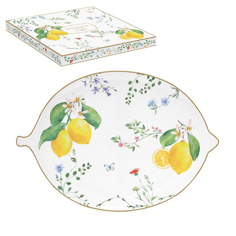 Posoda/pladenj iz porcelana z motivom limon. V darilni embalaži.