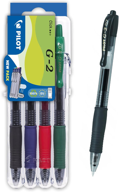 Set gel rolerjev G-2 07 v črni, modri, rdeči in zeleni barvi izpisa v praktični embalaži.