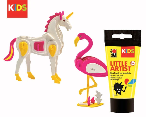 Vsebina: 1x 3D lesena sestavljanka unicorn, 1x 3D lesena sestavljanka flamingo, 3x36 ml Litlle Artist art and craft barve (033 pink, 070 bela, 019 rumena), 1x robusten ploščat čopič št. 10. Nasvet: ko barvate koščke sestavljanke, nosite stara oblačila ali slikarski predpasnik. Morebitne madeže barv na tkanini lahko takoj operite pri 30°C.