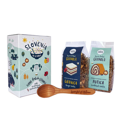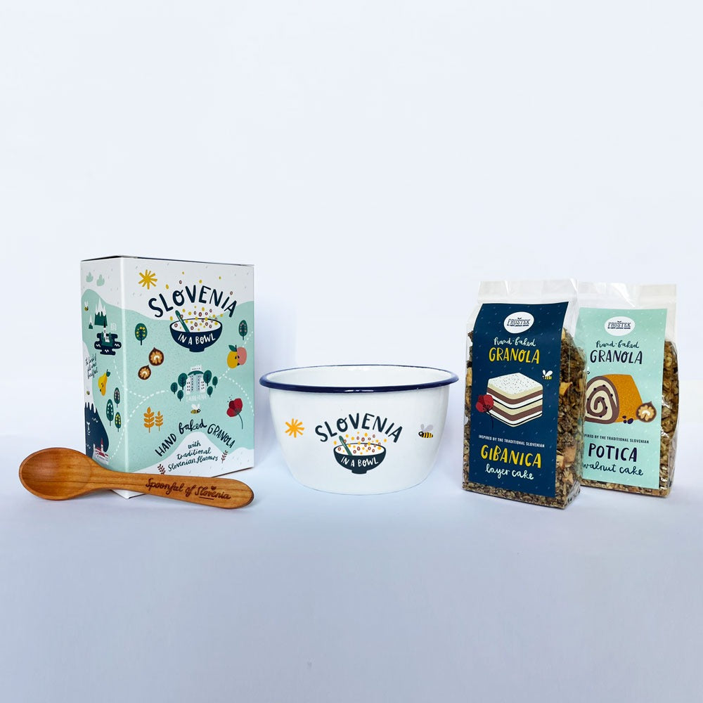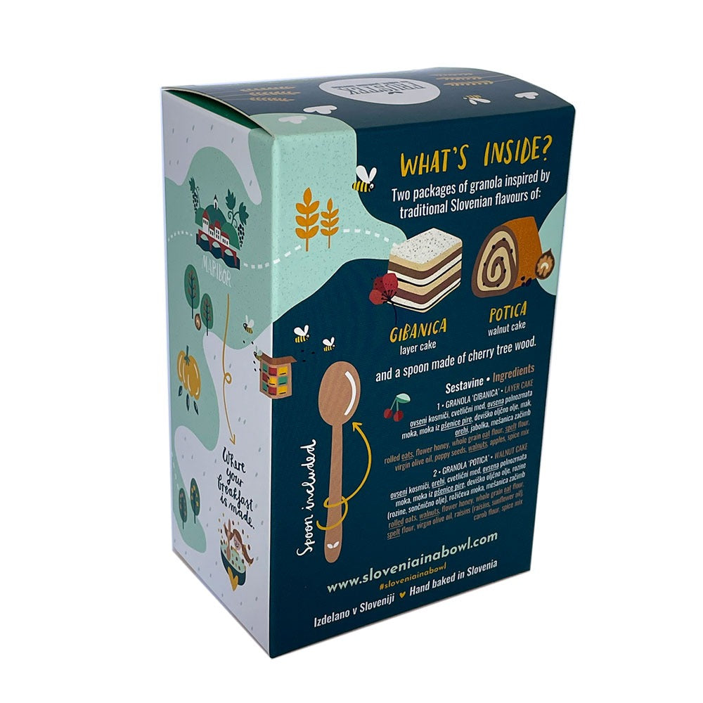 Kot je razvidno že iz same embalaže, je Slovenija rodovitna pokrajina, polna nasadov jablan, orehov in žitnih polj. Te surovine so neizogibno pogojevale nastanek tradicionalnih slovenskih sladic. Dve najbolj značilni, orehovo potico in prekmursko gibanico, smo priredili po “fruštkovo” in po njunem navdihu spekli še granolo. Granolo lahko pojeste takoj, ker paketek vsebuje leseno žličko iz češnjevega lesa, ki ostane trajen spominek, tudi ko granolo že pohrustamo 🙂