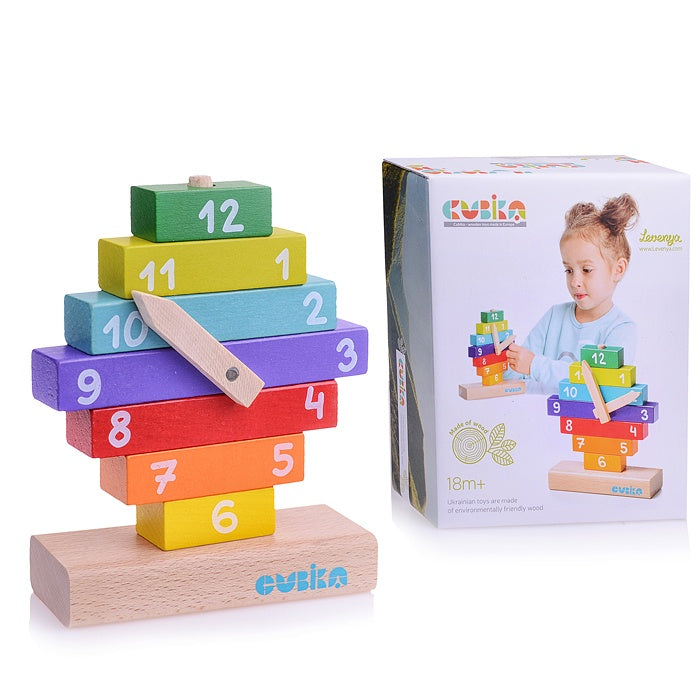 V kompletu je 9 elementov, ki jih lahko zložite enega na drugega. Priložnost, da otroka seznanite z različnimi barvami, urami in številkami. Razvija motorične sposobnosti in logično razmišljanje.